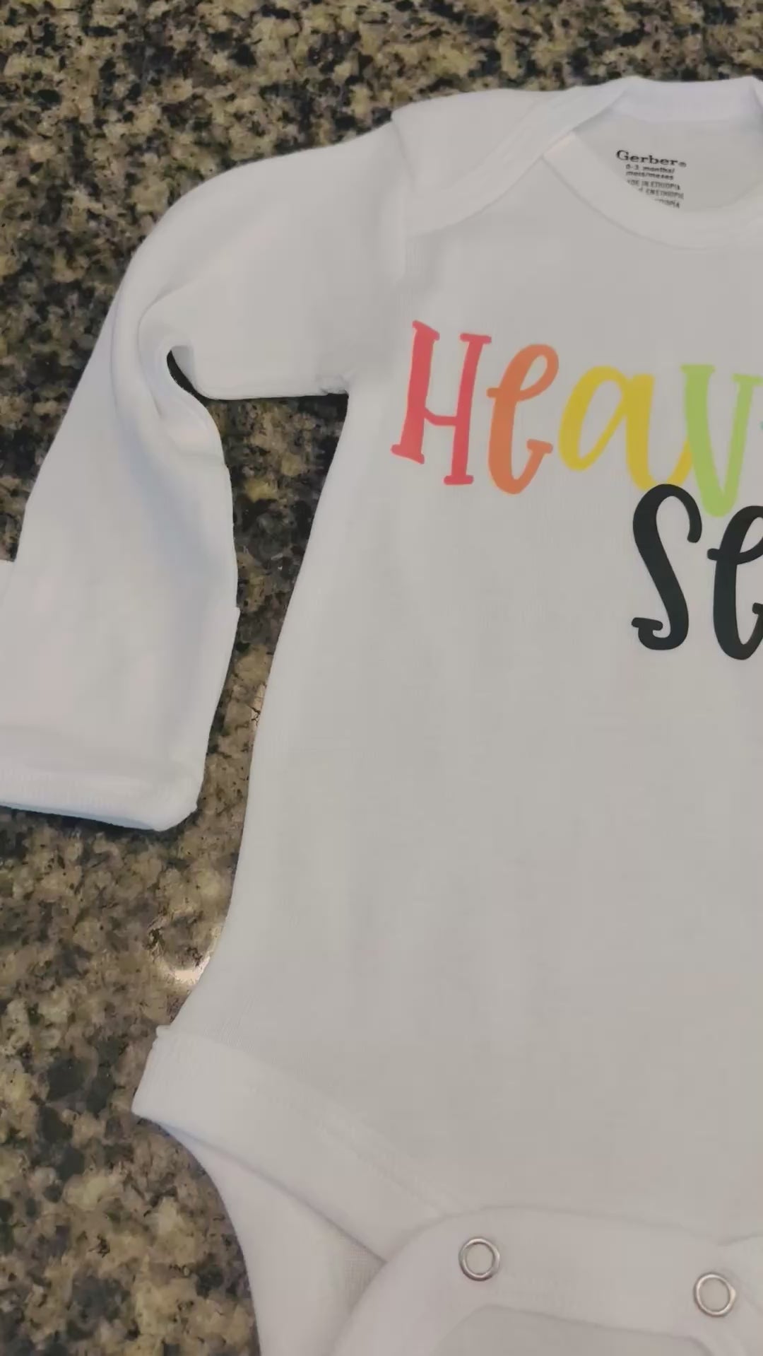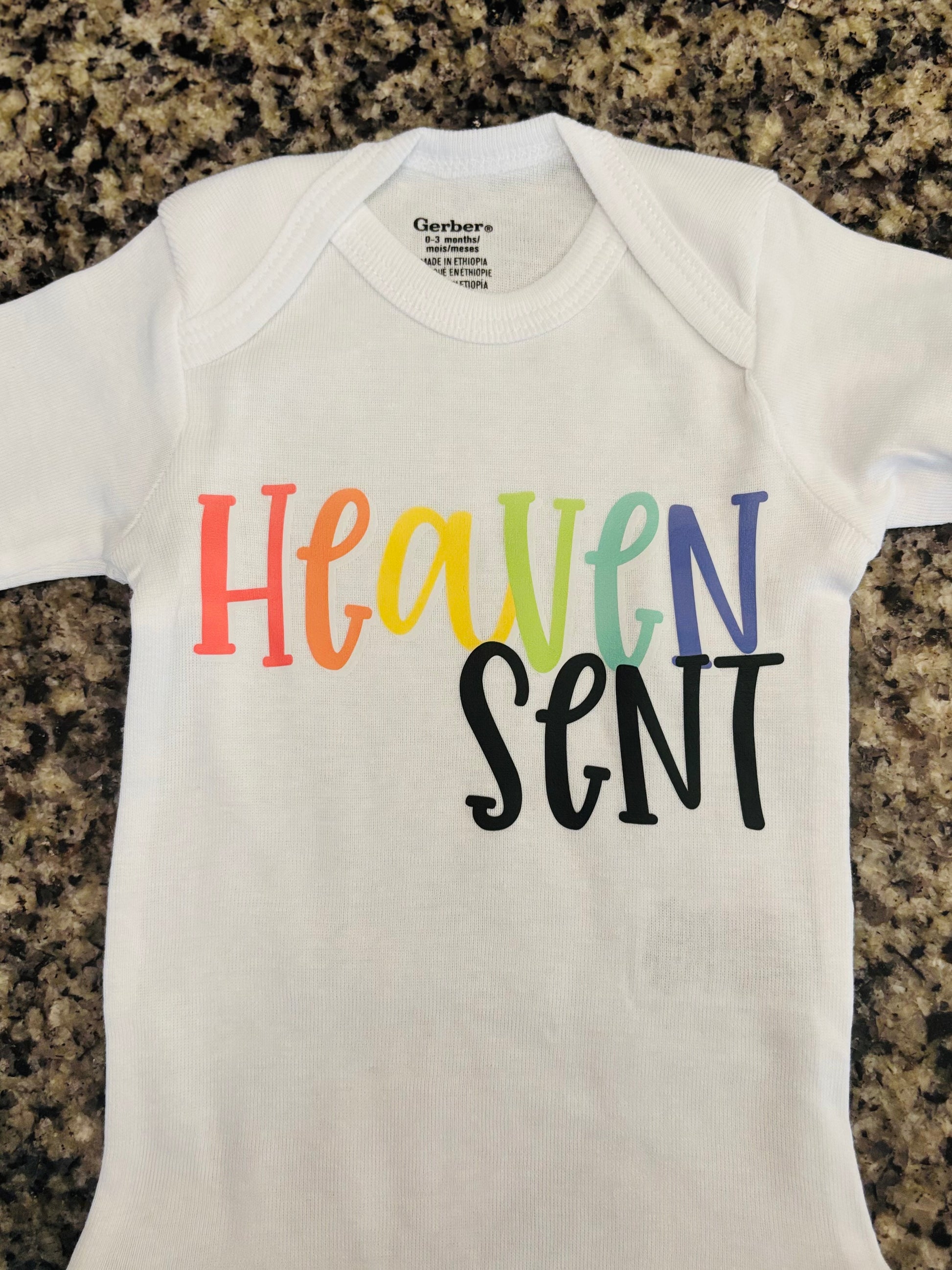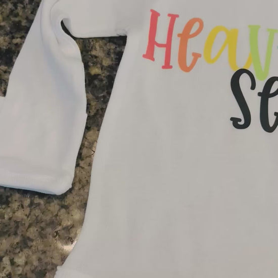 Celebrate your little blessing with this adorable “Heaven Sent” baby onesie — featuring sweet rainbow-colored lettering that adds a cheerful pop of color to your baby's wardrobe. Whether you're welcoming a rainbow baby, gifting a new arrival, or dressing your little one in something meaningful, this onesie is a beautiful reminder of where all good things come from — above. 💖